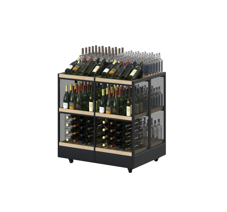 Módulo independiente de tres niveles, diseñado para una exposición versátil de vinos y bebidas espirituosas. Perfecto como isla central, permite una presentación completa y envolvente del producto.